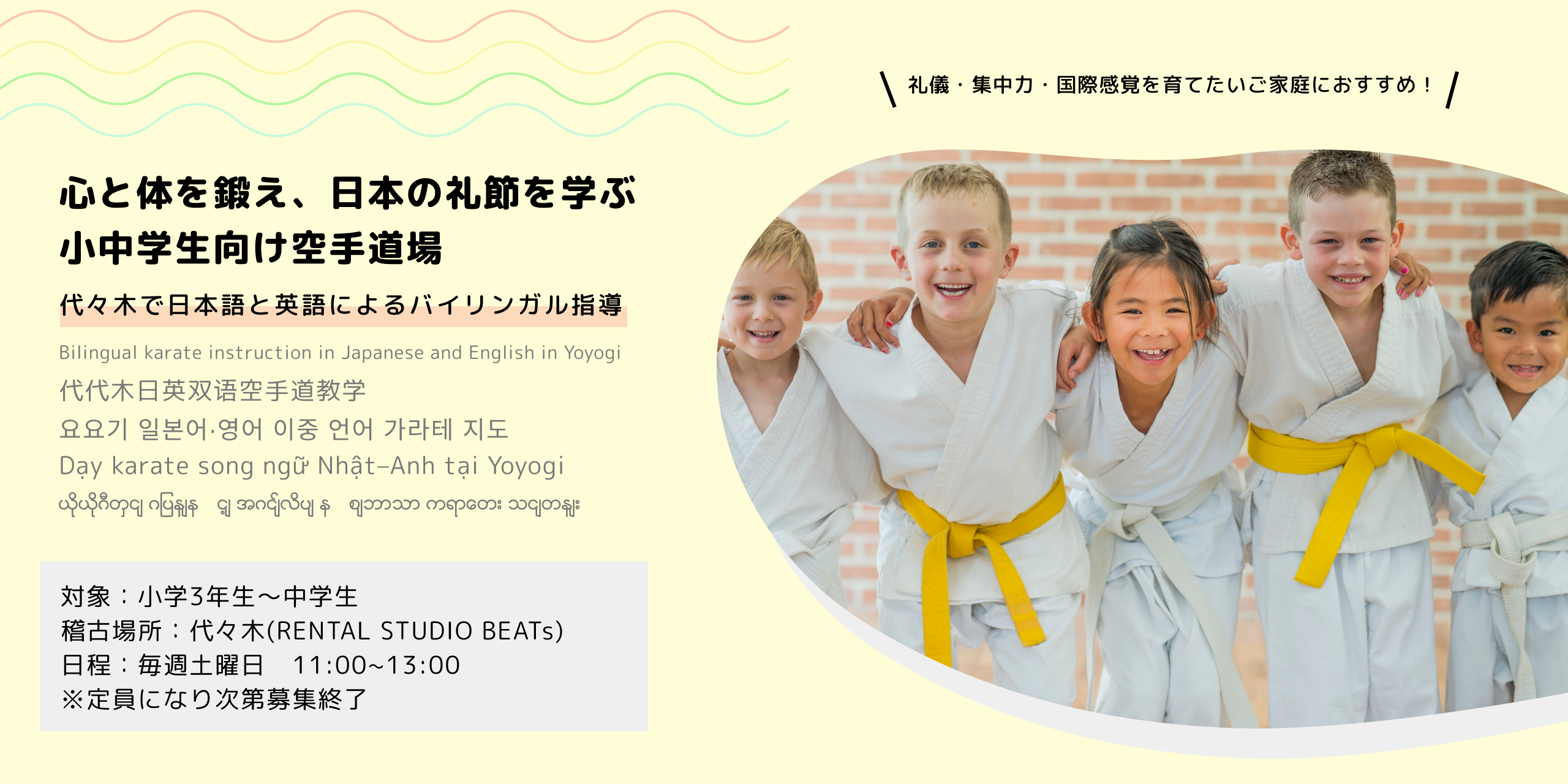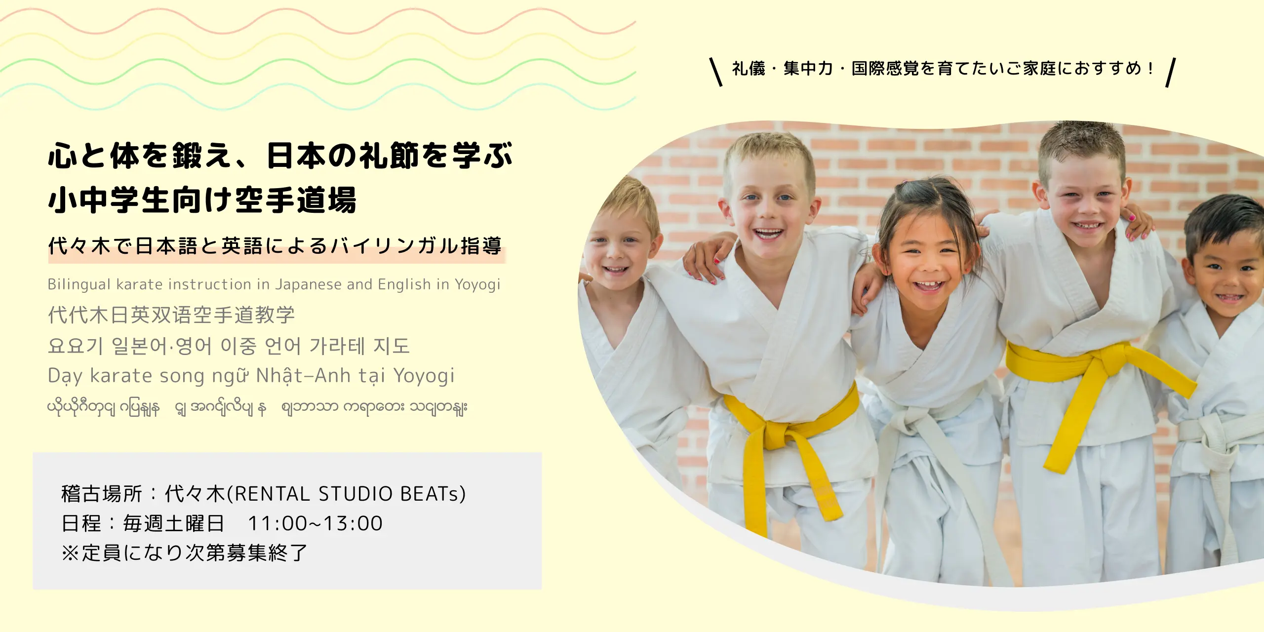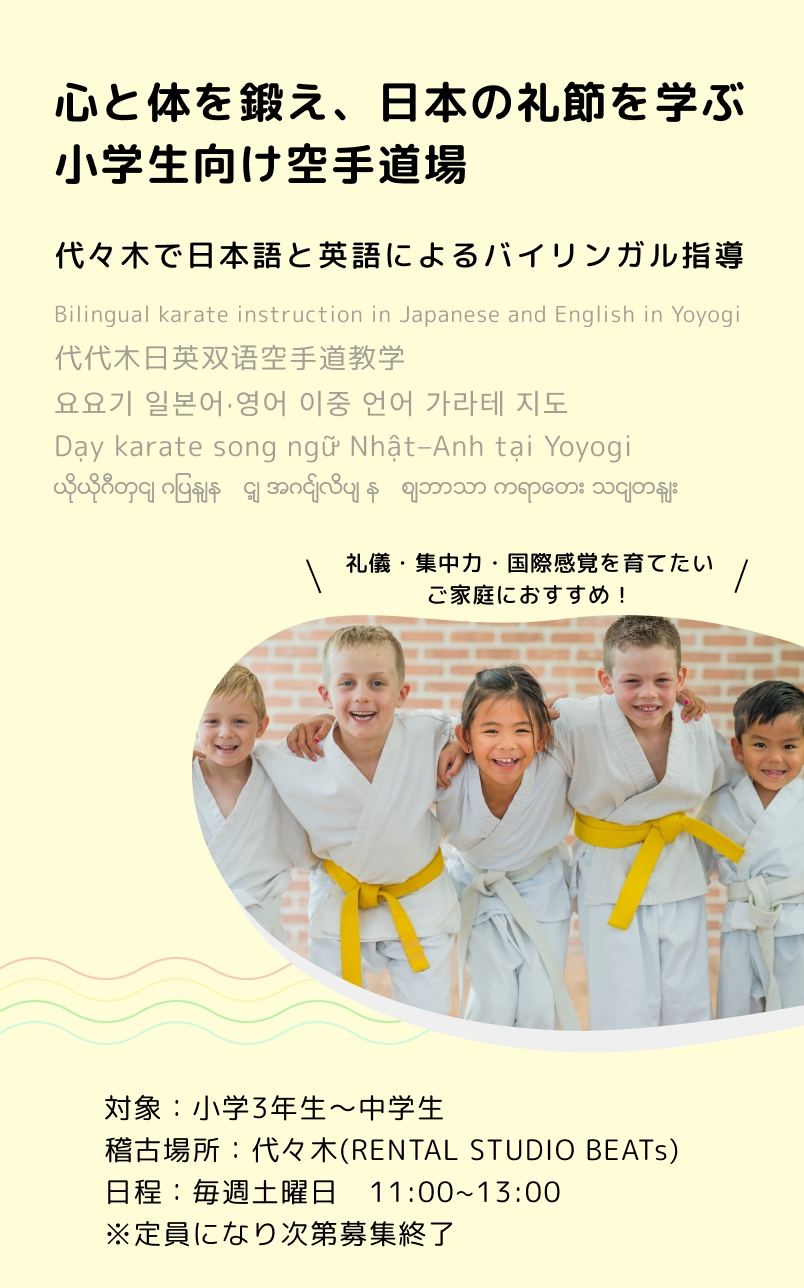 東京には、さまざまな国籍や背景を持つ子どもたちが集まります。 当道場では、その多様な環境の中で、空手を通じて礼儀・集中力・思いやりといった 日本の文化に根づいた価値観を丁寧に身につける場を提供しています。